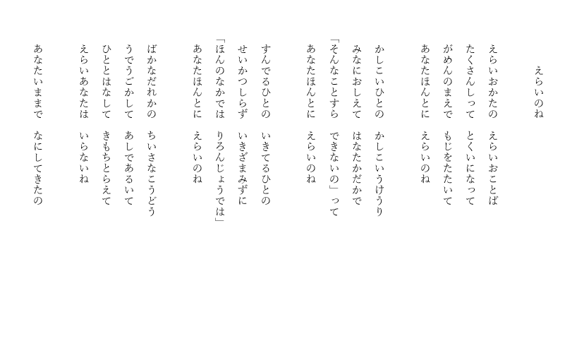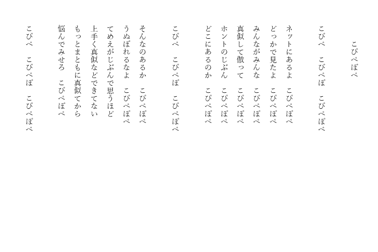 元々は、谷川俊太郎さんの言葉遊び歌みたいな感じの、口に出して楽しいリズムの物を作ろうと思っていたのですが、最終的に毒が出てきてしまって何だかな、という感じです。